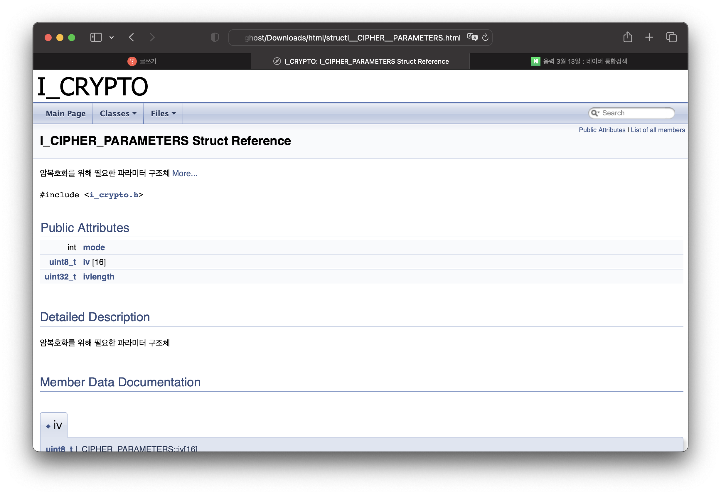 이것도 Doxygen으로 보여주겠다. 이 구조체는 블록암호운용모드를 설정하는 mode(1이면 cbc, 2면 ctr) 그리고 iv와 iv의 길이를 저장하고 있다. 사실 보다 추가적인 요소들도 포함하고 있어야 하겠지만 이 프로젝트에선 이정도만 담기로 하였다. 그리고 사실 애초에 파라미터도 많아서 이것마저 구조체로 묶지 않으면 함수 파라미터가 너무 많아진다 ㅠㅠ 아무튼 이런식으로 암복호화 함수를 구현하였고 다음 글에선 내부상태를 저장하며 데이터를 분할하여 암호화와 복호화를 진행할 수 있는 init, update, final에 대해 다뤄보겠다. 그럼 다음에 봐용