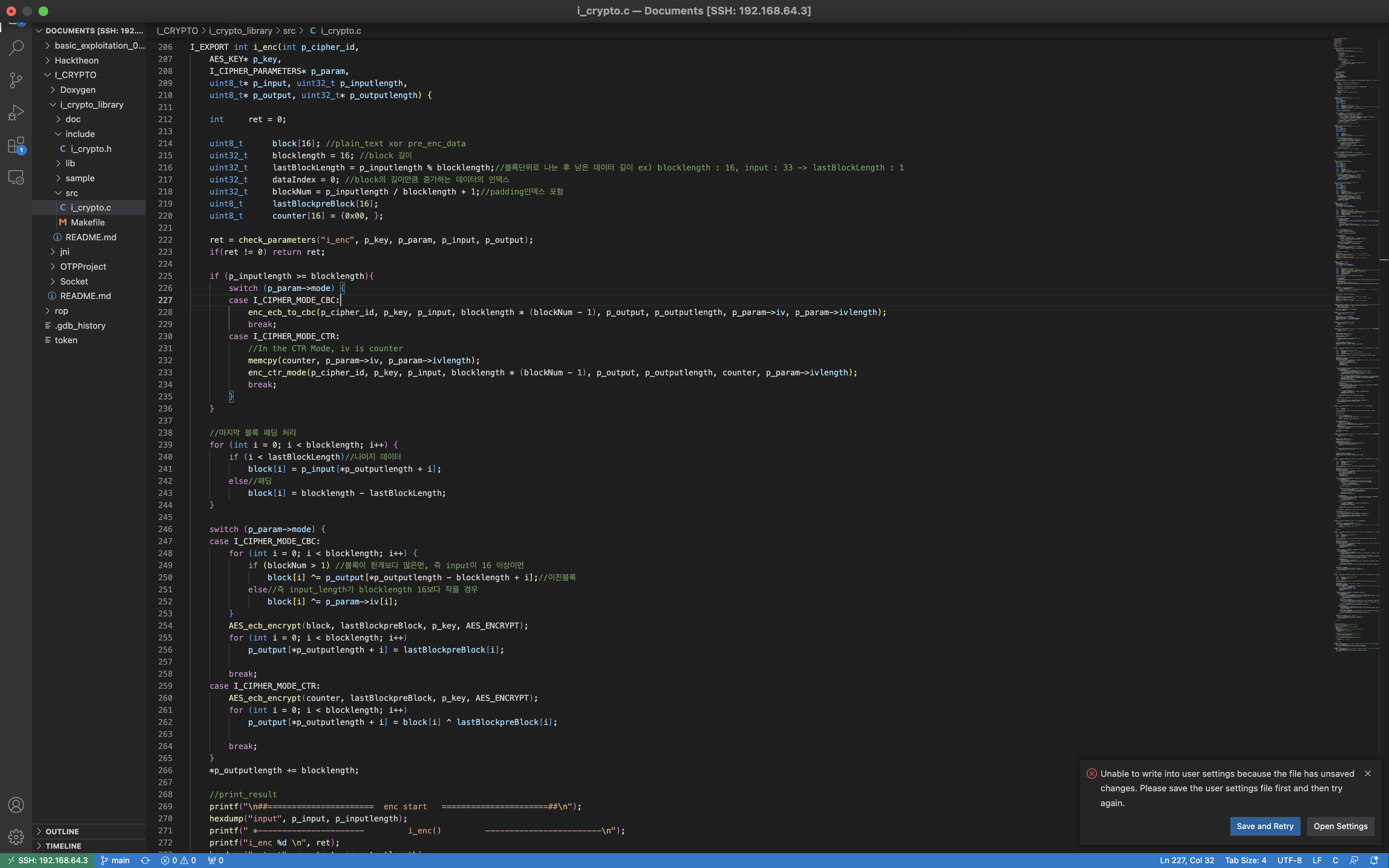 이 후 아래 225부터 236라인을 보자. 여기서 조건이 p_inputlength >= blocklength라고 되어있는데 기본적으로 한 블록의 사이즈는 16바이트이다. 그리고 암호화는 무조건 16의 배수가 되도록 패딩을 붙여서 진행하게 된다. 만약 데이터가 16보다 작은 8이 들어왔다고 가정하자. 그렇다면 패딩 8을 붙여 16바이트를 맞춘 후 암호화를 진행한다. 만약 딱 맞게 16이 들어오면 16바이트를 암호화하고, 패딩으로만 16바이트를 만들어 이것을 암호화한다. 16보다 큰 36이 들어왔다면 16의 배수로 끊어야하므로 32바이트는 암호화하고 남은 4바이트에 12바이트 패딩을 더한 후 최종 암호화를 마무리한다. 이때 패딩은 pkcs7방식으로, 비어있는 바이트를 패딩값으로 집어넣는다. 만약 데이터가 12바이트이고 패딩 4바이트를 채워넣어야 한다면, 패딩은 0x04가 네 번 들어가는 형식이다. 여기서 알 수 있는 건, 16이 딱 맞게 들어오면 패딩으로만 16바이트를 만들어 붙이는 것처럼, 패딩처리를 안하는 경우는 없다. 어찌되었든 우선 16바이트 이상이라면 16의 배수만큼은 cbc나 ctr에 그대로 돌리고, 그 후 남은 나머지 데이터는 패딩처리 후 암호화하는 방식이다.