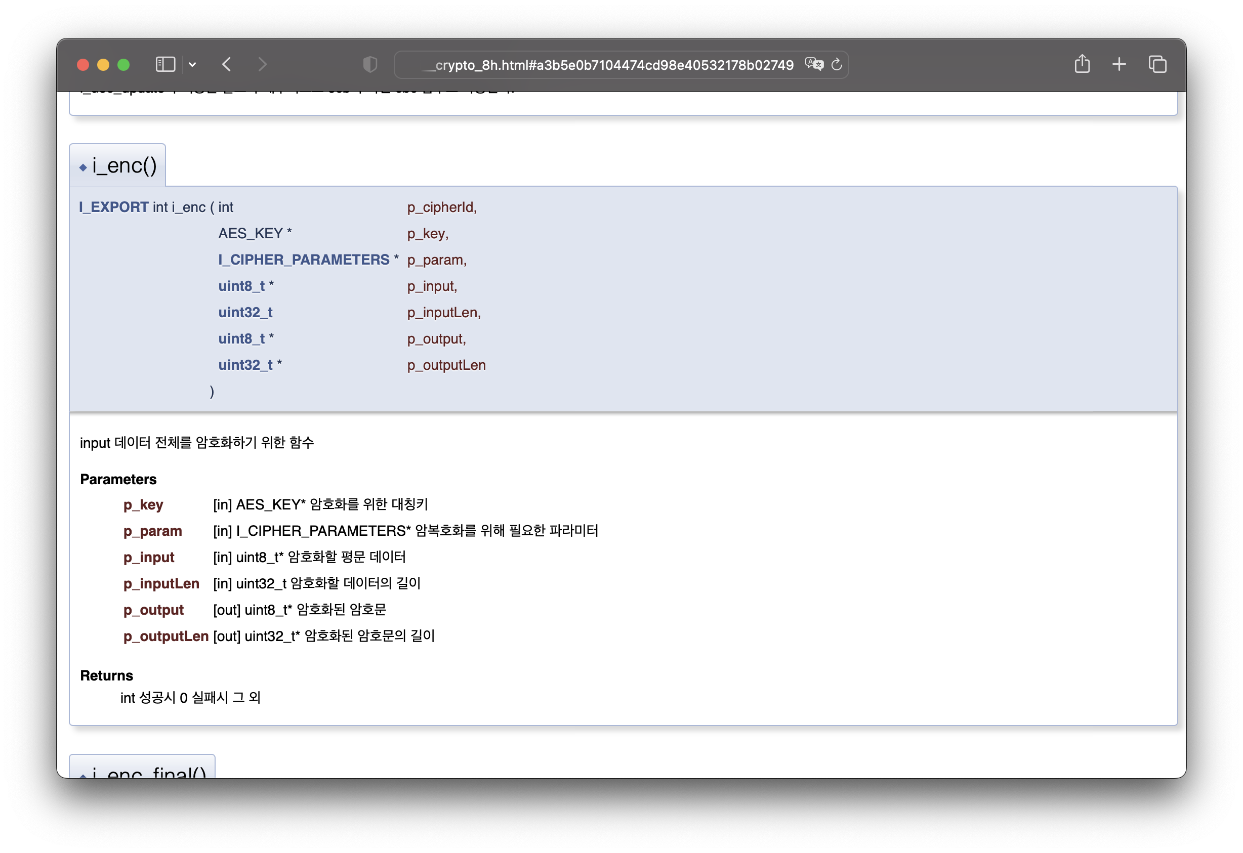 이것도 Doxygen으로 보여주겠다. 이 구조체는 블록암호운용모드를 설정하는 mode(1이면 cbc, 2면 ctr) 그리고 iv와 iv의 길이를 저장하고 있다. 사실 보다 추가적인 요소들도 포함하고 있어야 하겠지만 이 프로젝트에선 이정도만 담기로 하였다. 그리고 사실 애초에 파라미터도 많아서 이것마저 구조체로 묶지 않으면 함수 파라미터가 너무 많아진다 ㅠㅠ 아무튼 이런식으로 암복호화 함수를 구현하였고 다음 글에선 내부상태를 저장하며 데이터를 분할하여 암호화와 복호화를 진행할 수 있는 init, update, final에 대해 다뤄보겠다. 그럼 다음에 봐용