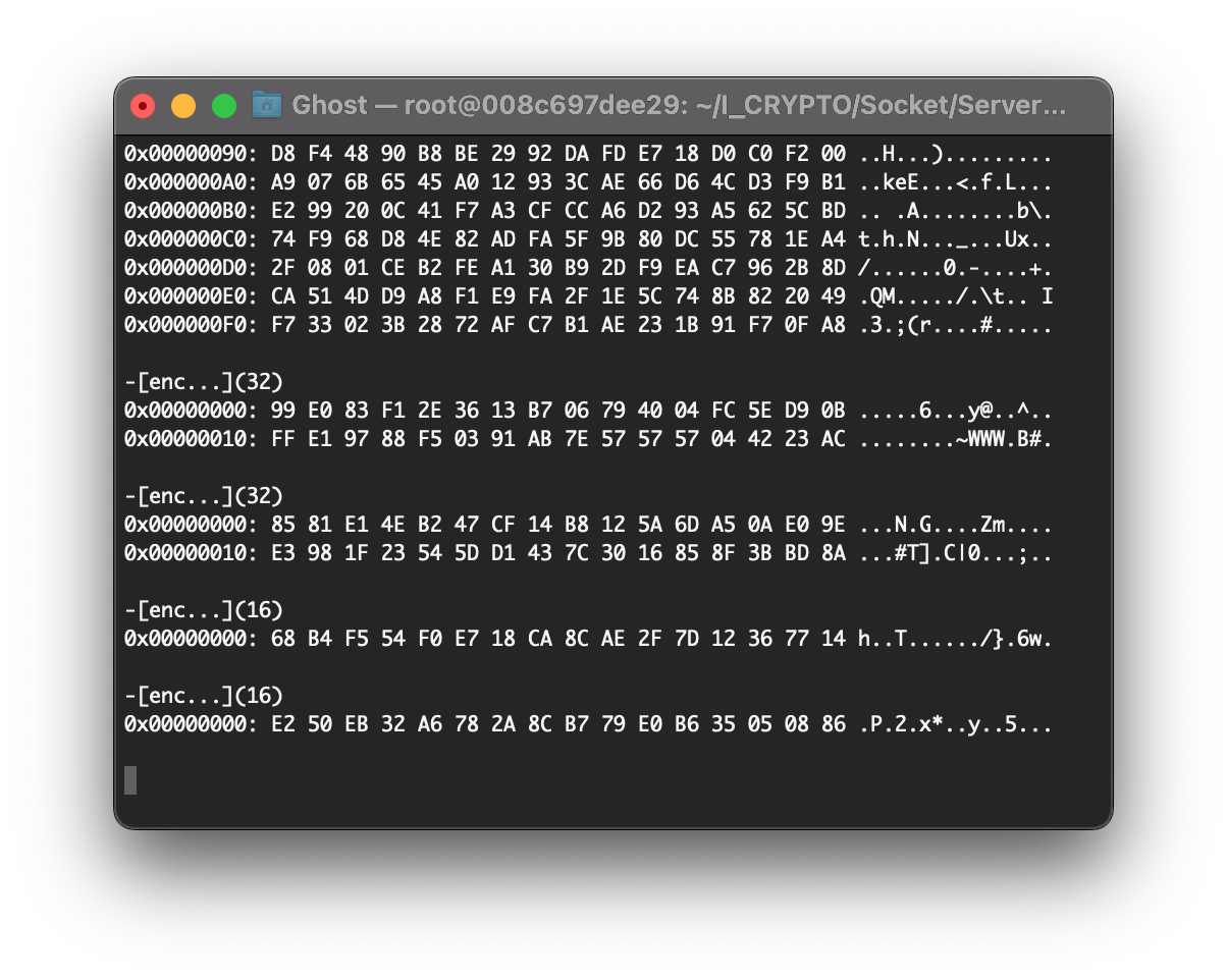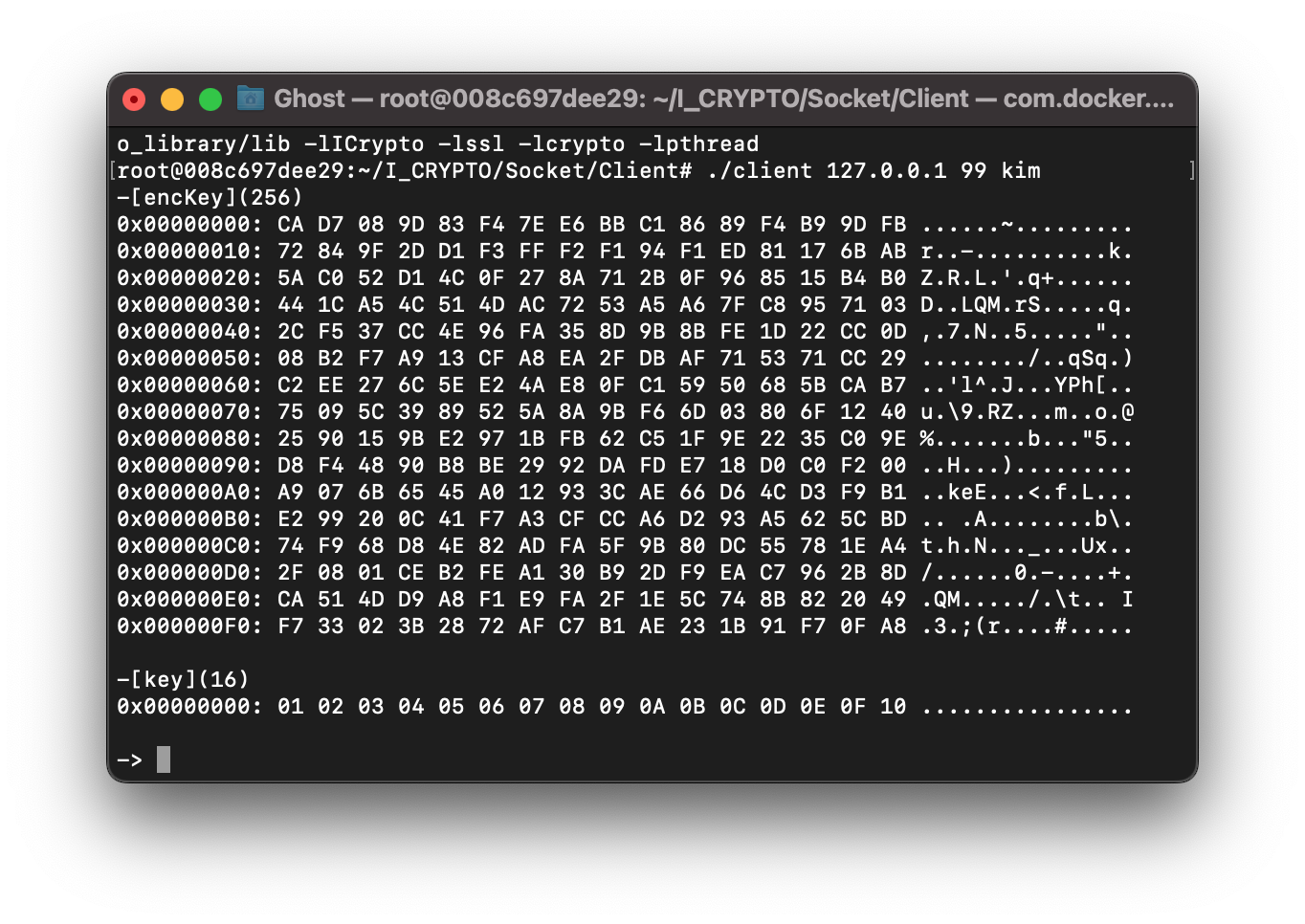크립토 라이브러리 자체를 구현한 것과, 이렇게 직접 만든 라이브러리 함수를 이용해, 암호화된 통신을 하는 소켓 프로그램을 만들었다는 것에 뭔가 스스로 실력이 향상한 것을 느낄 수 있었다. 이론으로만 배웠던 보안 지식들을 직접 구현하는 것은 생각 이상으로 매우 큰 도움이 되었고, 시험기간 외우기만 해서 금방 까먹었던 것들도 직접 내 손으로 만들다 보니 어느정도 머리에 박힌 것 같다. 또 간단한 프로그램을 짜더라도 어떻게 하면 더 안전하게 만들 수 있는지 그런 방법 같은 것들을 머릿속으로 자연스럽게 떠올리고 고민하게 된 것 같다. 내가 많은 발전을 했다고 느끼는 코드이다. 이렇게 소켓에 대한 부분도 끝이 났다. 다음 글에서는 OTP를 구현한 코드에 대한 글을 쓰며 이 I_CRYPTO 프로젝트에 대한 글이 끝나게 될 것이다. 이제 마지막을 향해 달려가 보겠다.