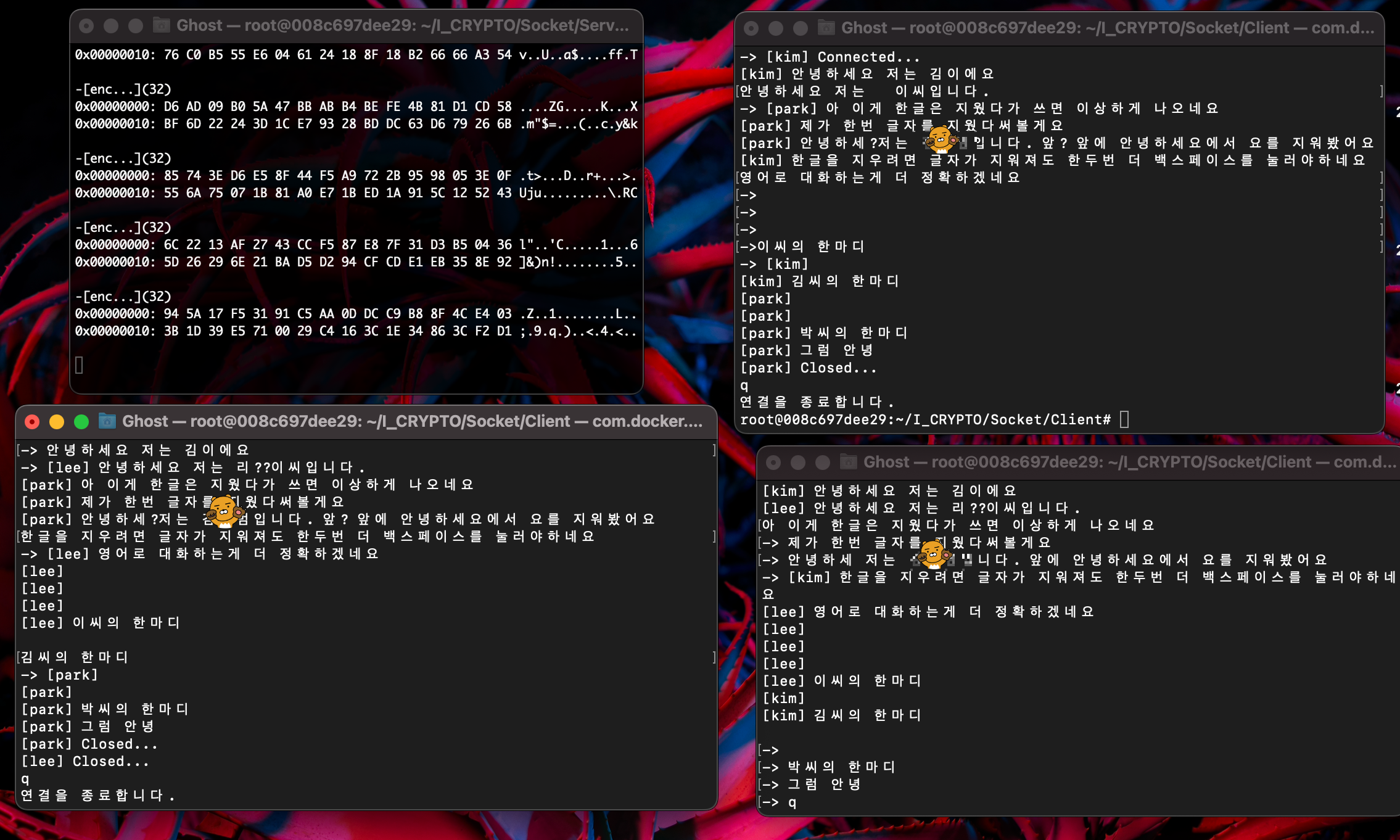 왼쪽 위는 서버로, 계속 암호화되어 전송되는 메시지들을 출력한다. 왼쪽 밑이 kim, 오른쪽 위가 lee, 오른쪽 아래가 park이다. 메시지 옆에 닉네임이 있으면 해당 닉네임의 클라이언트가 보낸거고, ->나 아무것도 없다면 자신이 입력한 것이다. 스티커는 테스트로 본명을 입력해 가린것이니 신경안써도 된다. q를 누르면 채팅을 종료하고 소켓을 끊는다. 여기서 테스트해본 결과 한글은 잘 되긴 하는데 지울때 글자는 지워져도 보이지 않는 특수문자같은 것이 남는 것 같다. 중간중간 물음표같은 것이 찍힌 것이 한글이 제대로 지워지지 않아서 생긴 것들이다. 영어는 매우 잘된다. 이렇게 간단하게 세개의 클라이언트가 채팅하는 모습을 캡쳐해 보았다.
