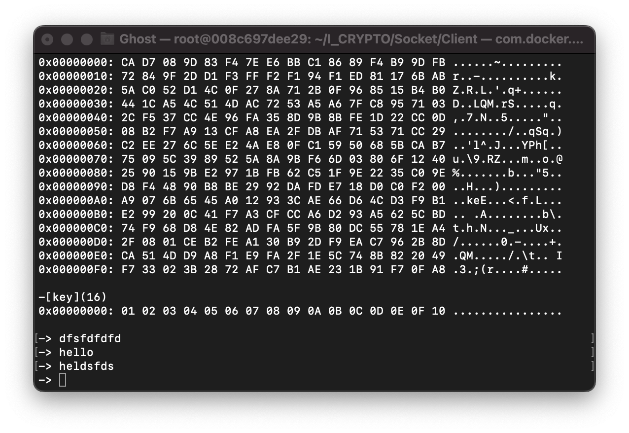 위는 클라이언트가 처음 접속했을 때 서버가 출력하는 키교환 과정이다. 처음 client의 퍼블릭 키를 받아 화면에 출력하고, 자신이 갖고 있는 대칭키를 출력, 이를 클라이언트의 공개키로 암호화한 데이터 출력, 그 후 이를 클라이언트에 보내게 된다. 클라이언트 화면을 보자.