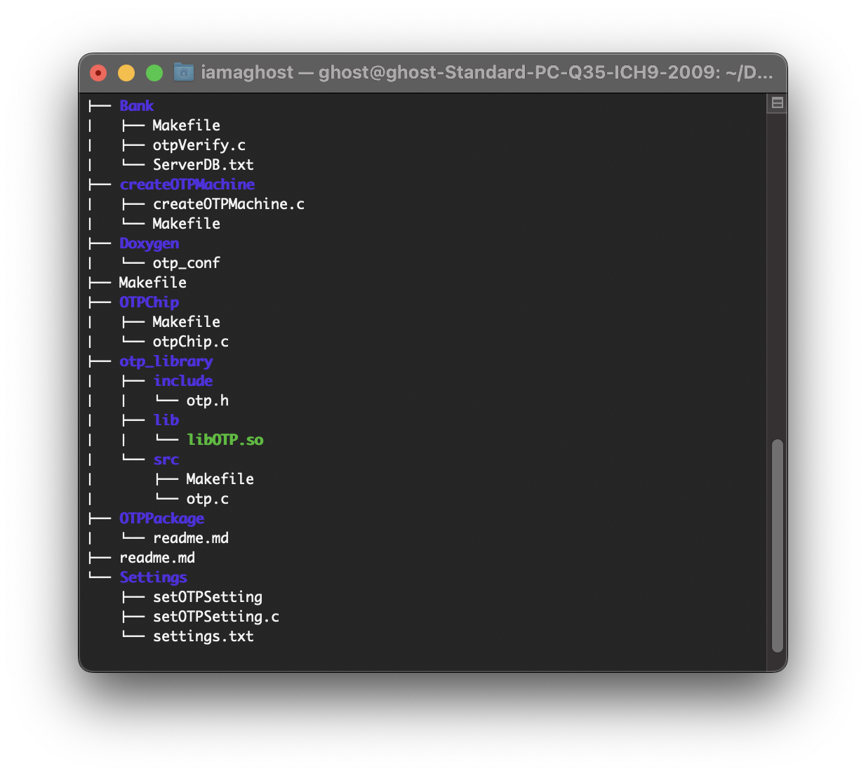 아래 createOTPMachine 디렉토리는 make명령어를 수행하고 내가 otp기계를 만들 디렉토리 명을 입력하면 해당 디렉토리에 otp기계를 생성하는 개념이다. 즉 createOTPMachine.c 파일을 실행하면 대충 test라는 디렉토리를 입력하면 test 디렉토리에 otpChip실행파일(이게 실제 otp기기라고 가정), serialNumber.txt(고객이 가지고 있어야할 시리얼 넘버), otpHD.txt(otp기기 하드디스크라고 보면된다) 가 자동으로 생성된다. 왜 삽질 했다고 했는지 느낌이 오지 않는가. otp원리를 공부할 때 사실 별 필요없는 코드인데, 뭔가 크게 만들어보고 싶어 만들어봤다....
