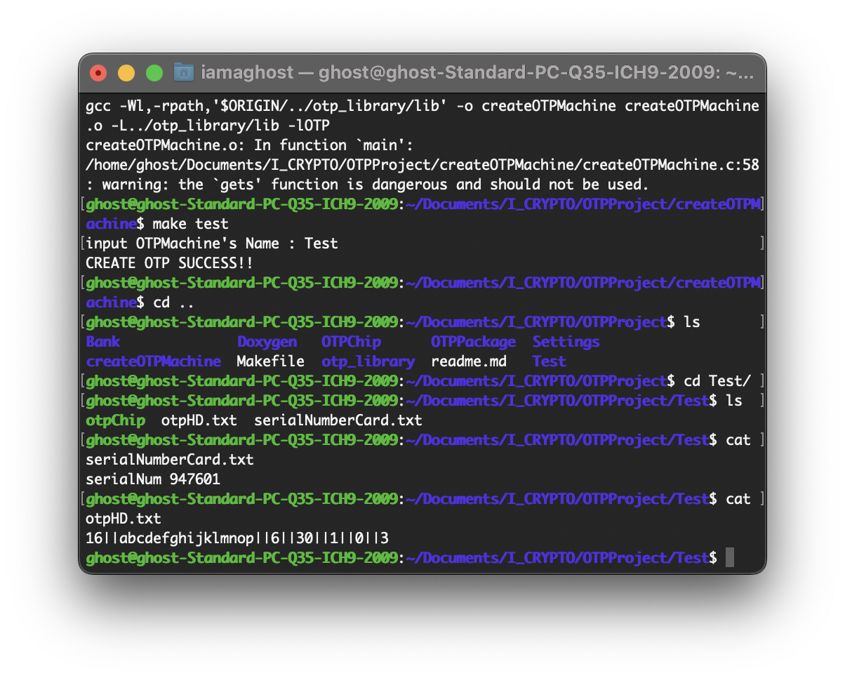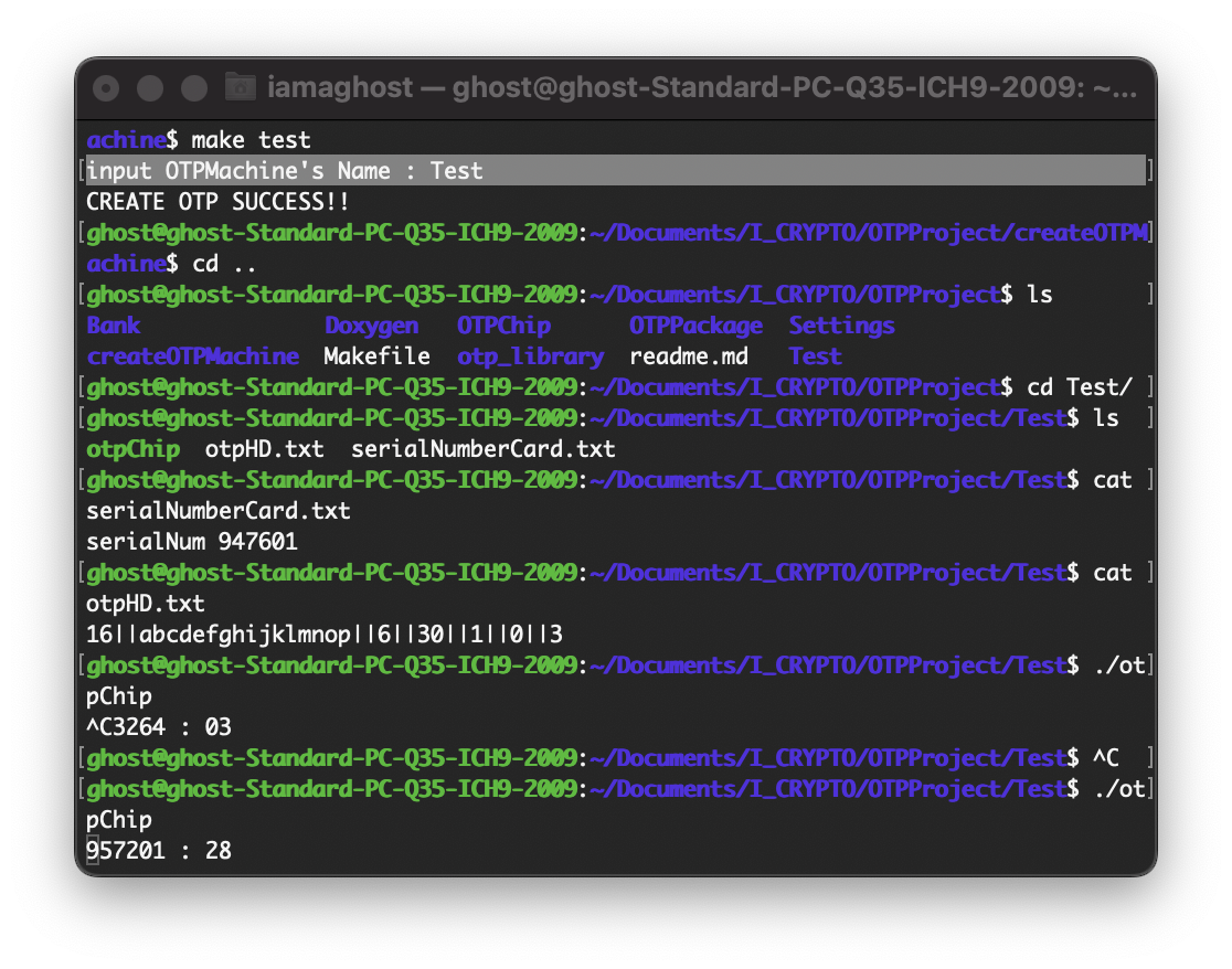 먼저 OTP를 생성할 디렉토리는 Test라는 이름으로 만들었다. Test 디렉토리를 만들고 OTPChip에서 make명령어를 수행해 otpChip 실행파일을 생성한다. 그 후 createOTPMachine에서 make, make test를 수행하고, Test 디렉토리를 입력하면 Test디렉토리에 자동으로 otpChip 실행파일과 otpHD.txt, serialNumCard.txt가 생성되는 것을 볼 수 있다.