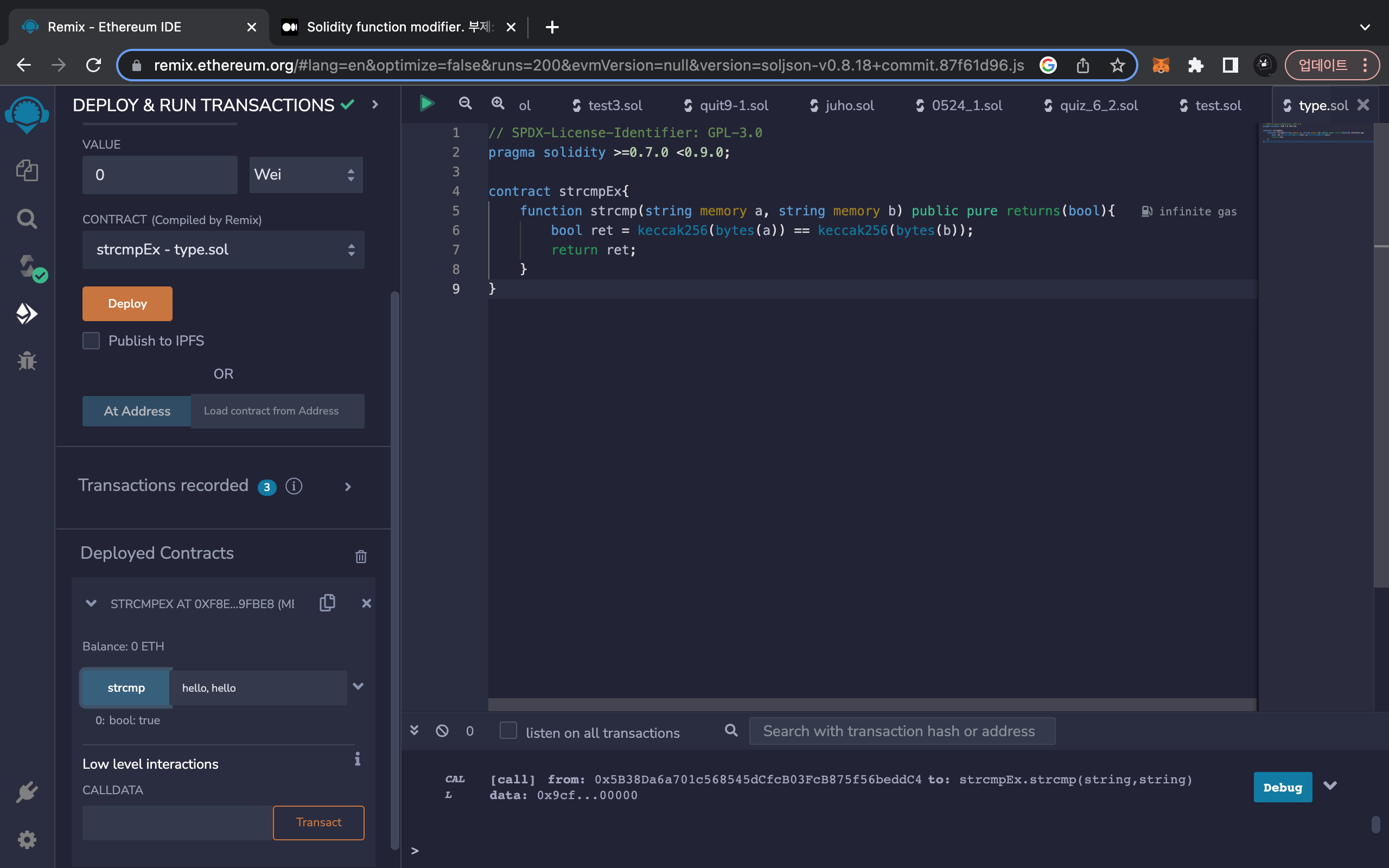 위에 strcmp함수는 string 매개변수 a,b 를 keccak256으로 비교해 같으면 true, 다르면 false를 리턴한다.