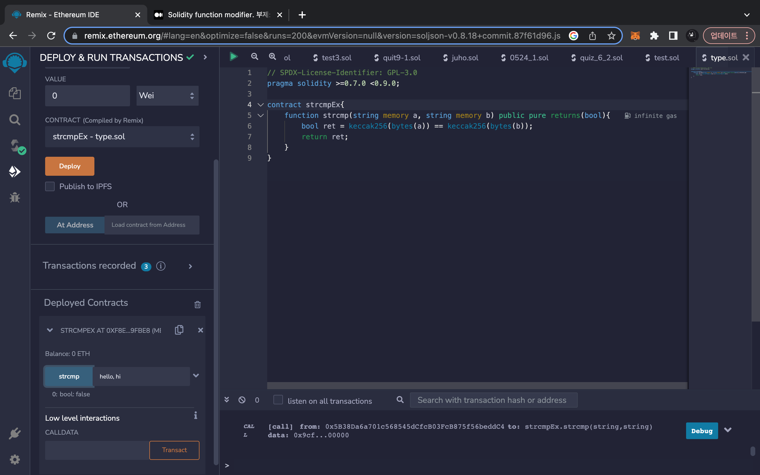 솔리디티는 문자열을 비교하는 함수가 기본적으로 제공되지 않나보다...