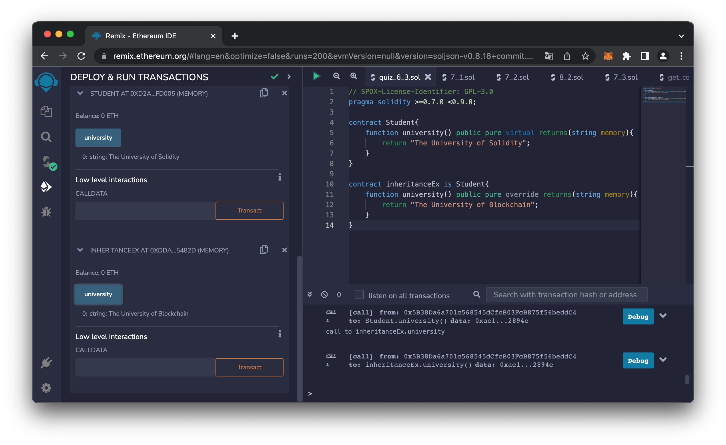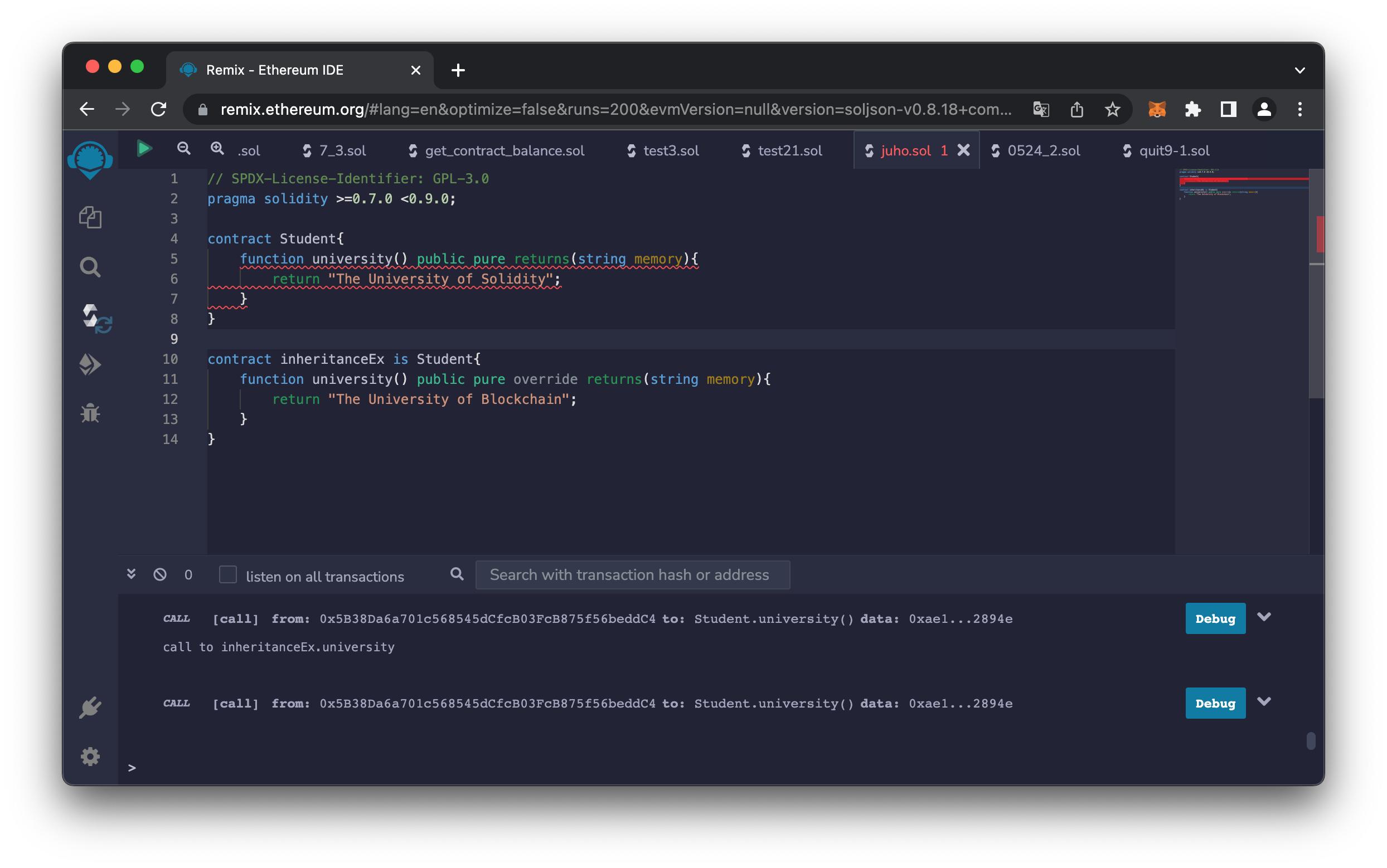 좌측 하단은 내부가 비어있는 inheritanceEx 컨트랙트를 deploy한 후 university를 호출하여 "The University of Solidity" 문자열을 출력한 것이다. 상속을 받았기 때문에 university()함수를 inheritanceEx에서 사용할 수 있는 것을 볼 수 있다. 이제 부모 컨트랙트의 함수를 오버라이딩 하는 것을 연습해보자.