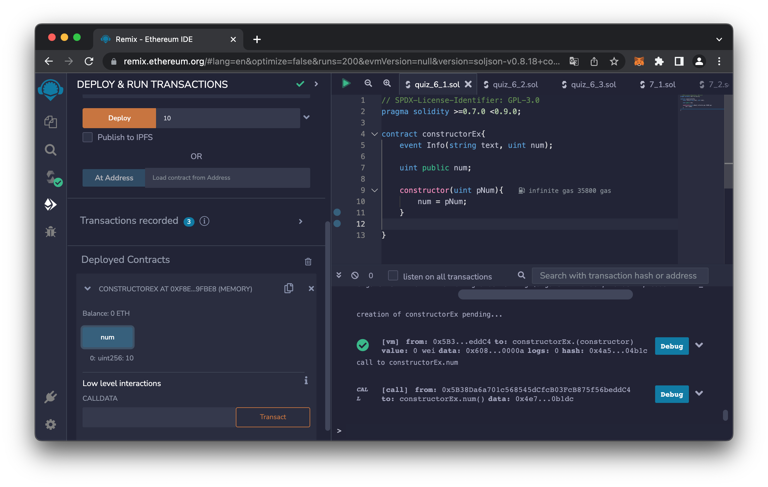 생성자의 pNum 파라미터를 10으로 설정 한 후 deploy 하였다. 위에서 매개변수를 지정하지 않았을 때와 달리 정상적으로 deploy되며 num의 getter로 num값을 확인해보면 10이 제대로 저장된 것을 확인할 수 있다.