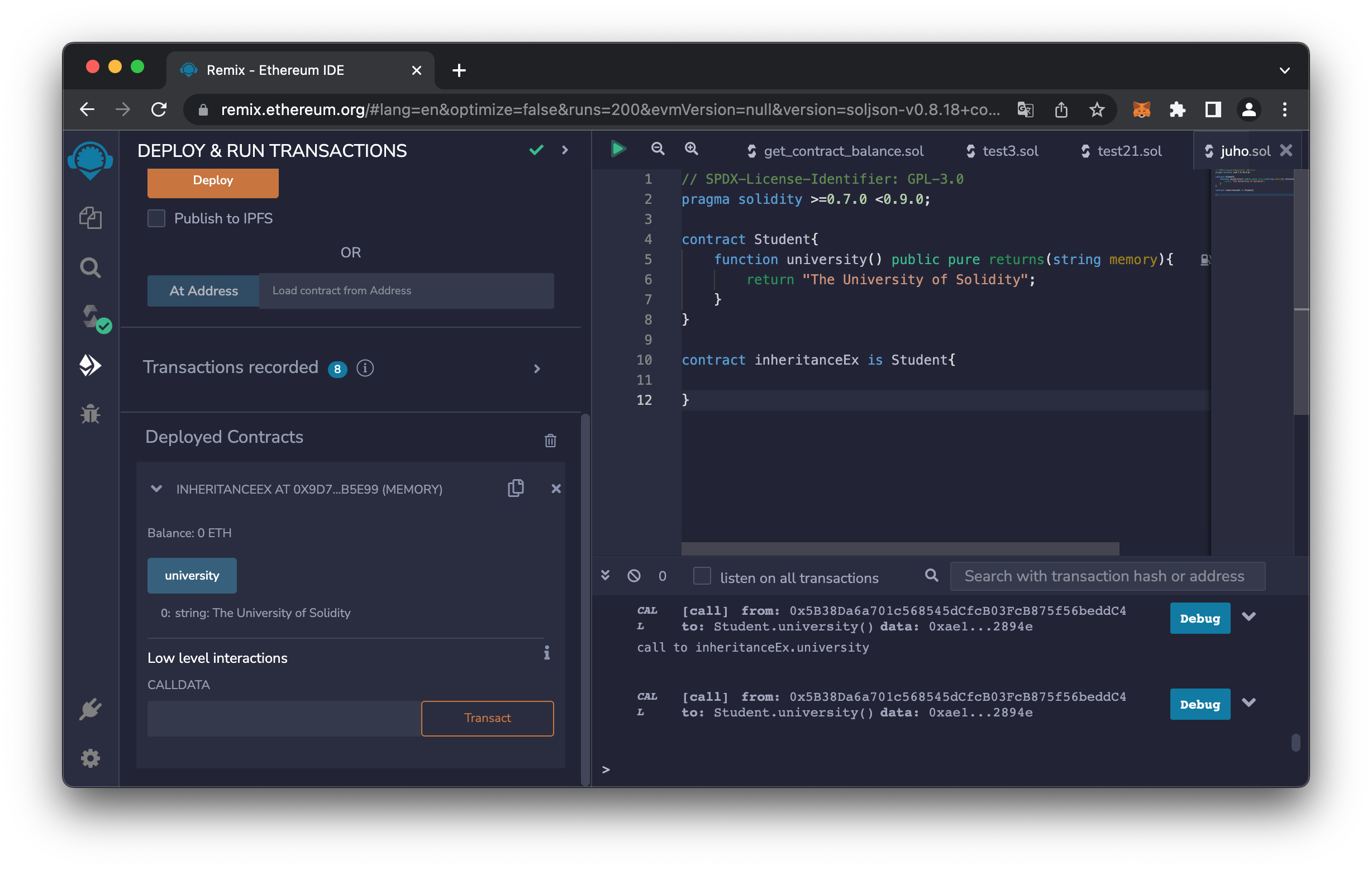 위 코드는 Student 컨트랙트를. inheritanceEx가 상속받는 코드이다. 솔리디티는 "is" 키워드를 통해 상속을 할 수 있다. 현재 inheritanceEx 컨트랙트 내부는 비어있으나 Student를 상속받았으므로, university() 함수를 사용할 수 있다. 확인해보자.