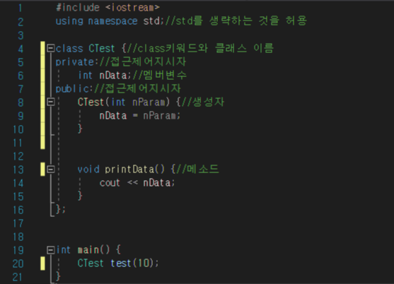 자 아주 간단하게 위의 코드를 보면서 클래스가 대충 이런 구조구나 하고 짚고 넘어가보겠습니다. 우선 클래스는 class라는 키워드로 선언하고 class키워드 옆에 이 클래스의 이름을 정의합니다. 여기서 typedef같은 키워드가 보이지 않는데요. 사용하지 않은 것이 아니라 사용할 필요가 없는 것입니다. 그 이유는 이제 구조체에서 typedef로 이름을 재선언했던 것처럼 할 필요가 없기 때문입니다. 그동안 C언어에서는 이름을 재선언함으로써 구조체 변수를 선언할 때 귀찮게 struct를 쓰는 행위를 방지할 수 있었는데요 클래스에서는 객체를 선언할 때 class라는 키워드를 붙이지 않아도 됩니다. 20번 코드를 보면 그냥 클래스의 이름만 기술하면서 객체를 선언한 것을 알 수 있습니다. 혹시 객체라는 말, 혹은 인스턴스라는 말이 조금 어렵게 느껴지신다면 검색을 통해 어느정도 느낌을 찾고 오시는 것을 추천드립니다. 제가 하나 설명드리자면 객체는 보통 광범위하게 어떤 클래스의 객체처럼 용어를 사용하고 인스턴스는 CTest클래스의 인스턴스와 같이 보다 특정 클래스의 객체다 라는 느낌으로 사용합니다. 현실에서 거의 구분하지 않고 사용하기도 합니다. 6번 라인에는 멤버 변수가, 그리고 13번 라인에는 멤버 함수가 정의되어있네요.